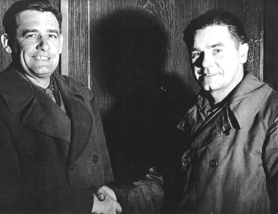 | This photo was used in an article in the Youngstown Vindicator. Adam (left) was in the the 33rd Signal Battalion of the 3rd Army. Wilson (right) was a member of the 94th Division of the 376th Infantry. The photo represents the meeting of the brothers in Tienville, France. The photo showed an anxious mother that two of her boys were okay. |
