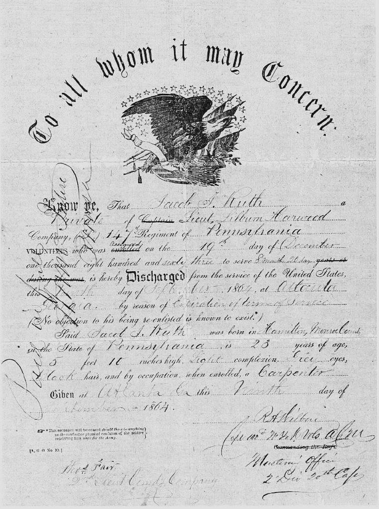 SERVICE.--Duty at Bolivar Heights, Va., until December, 1862. Reconnaissance to Rippon, W. Va., November 9, and to Winchester, Va., December 2-6. Moved to Fredericksburg December 10-14. At Stafford Court House until April 27, 1863. Burnside's 2nd Campaign, "Mud March," January 20-24. Chancellorsville Campaign April 27-May 6. Battle of Chancellorsville May 1-5. Gettysburg (Pa.) Campaign June 11-July 24. Battle of Gettysburg July 1-3. Pursuit of Lee July 5- Sept 24. Movement to Bridgeport, Ala., September 24-October 3. Reopening Tennessee River October 26-29. Wauhatchie, Tenn., October 28-29. Chattanooga Ringgold Campaign November 23-27. Battles of Lookout Mountain November 23-24; Mission Ridge November 25; Ringgold Gap, Taylor's Ridge, November 27. Guard duty on Nashville & Chattanooga Railroad until April, 1864. Expedition down the Tennessee River to Triana, Ala., April 12-16. Atlanta (Ga.) Campaign May 1-September 8. Demonstration on Rocky Faced Ridge May 8-11. Dug Gap or Mill Creek May 8. Battle of Resaca May 14-15. Near Cassville May 19. New Hope Church May 25. Operations on line of Pumpkin Vine Creek and battles about Dallas, New Hope Church and Allatoona Hills May 26-June 5. Operations about Marietta and against Kenesaw Mountain June 10-July 2. Pine Hill June 11-14. Lost Mountain June 15-17. Gilgal or Golgotha Church June 15. Muddy Creek June 17. Noyes Creek June 19. Kolb's Farm June 22. Assault on Kenesaw June 27. Ruff's Station, Smyrna Camp Ground, July 4. Chattahoochie River July 6-17. Peach Tree Creek July 19-20. Siege of Atlanta July 22-August 25. Operations at Chattahoochie River Bridge August 26-September 2. Occupation of Atlanta September 2-November 15. Near Atlanta November 9. March to the sea November 15-December 10. Siege of Savannah December 10-21. Campaign of the Carolinas January to April, 1865. North Edisto River, S.C., February 12-13. Red Bank and Congaree Creek February 15 Averysboro, N. C., March 16. Battle of Bentonville March 19-21. Occupation of Goldsboro March 24. Advance on Raleigh, N. C., April 9-13. Occupation of Raleigh April 14. Bennett's House April 26. Surrender of Johnston and his army. March to Washington, D.C., via Richmond, Va., April 29-May 20. Grand Review May 24. Duty in the Dept. of Washington until July. Companies "F" and "G" mustered out June 6, 1865. Regiment mustered out July 15, 1865.
